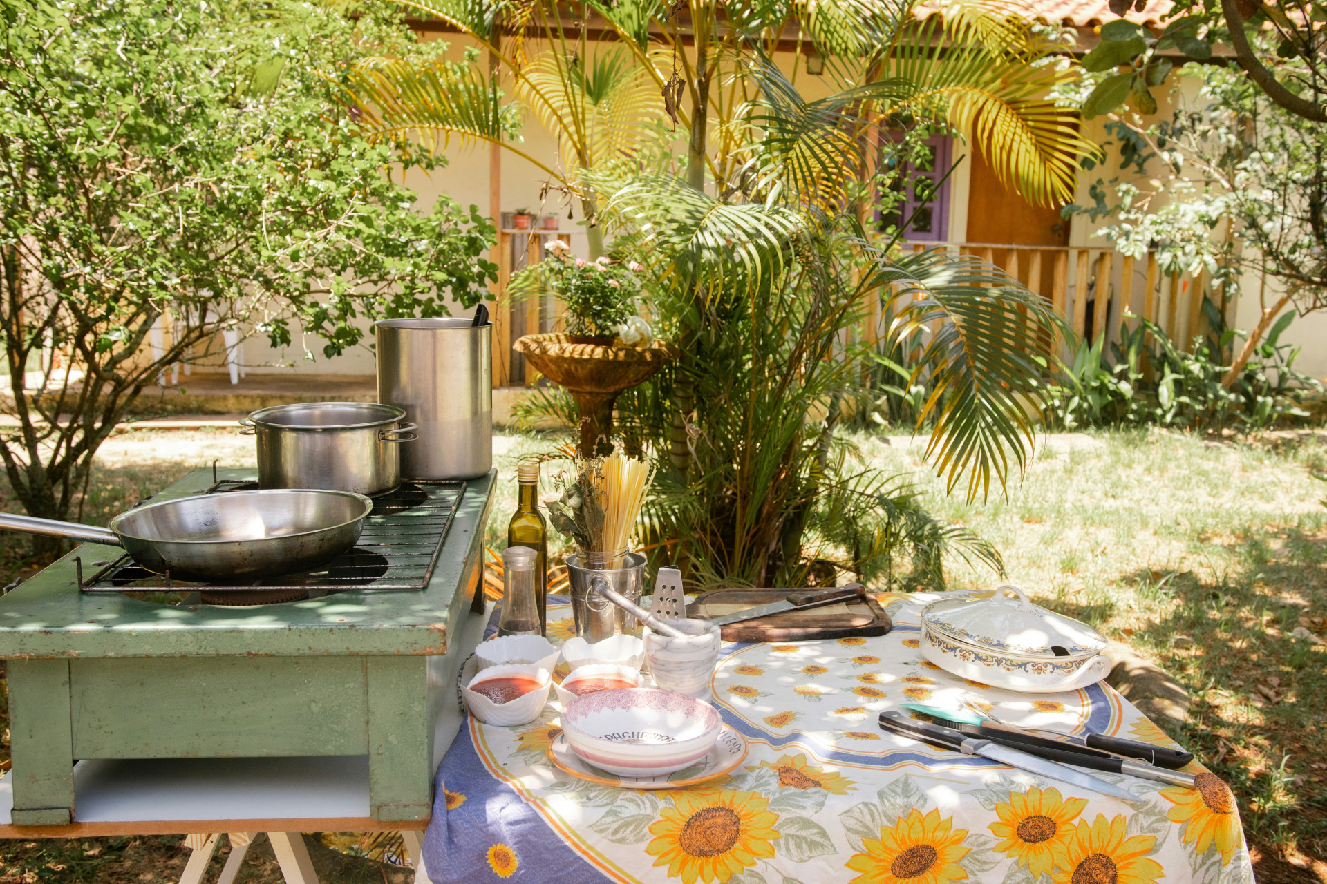 Ved siden af grillen findes et separat gasblus på 3,2 kW, der kan bruges til at koge eller varme tilbehør. En integreret håndvask med vandhane gør det muligt at skylle råvarer direkte ved arbejdspladsen. Vasken tilsluttes en haveslange, og afløbet kan ledes til bed eller spand.
